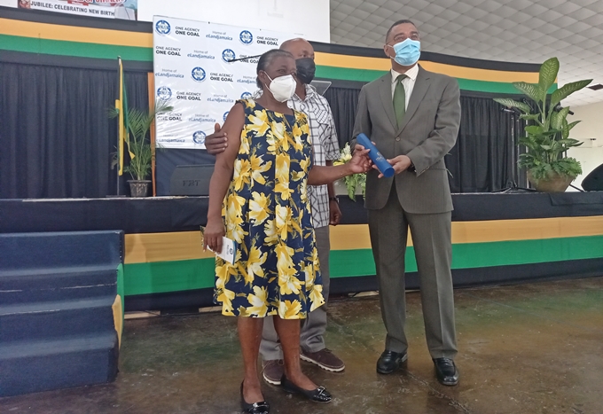 Ann Knight (left), a resident of Herring Lane, Church Pen receives her land title from Prime Minister Andrew Holness. (Oh News Photo)