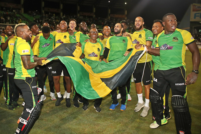 Jamaica Tallawahs celebrate winning the 2022 CPLT20 championship.