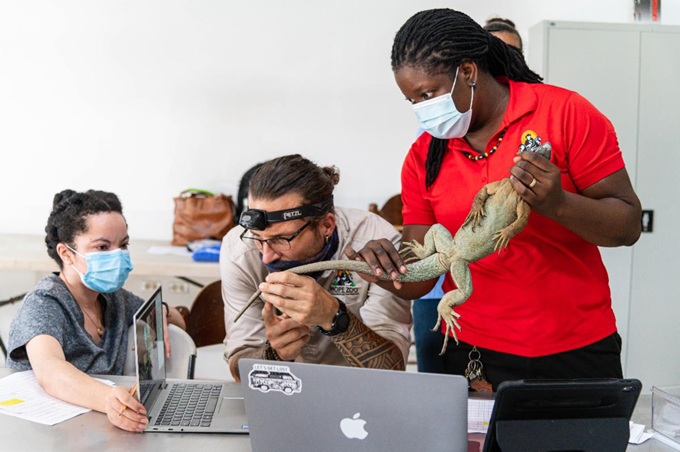 From left: Dr Kimberley Stephenson, biologist and lecturer from University of West Indies, Hope Zoo Kingston General Curator Joey Brown and Senior Reptile Keeper Jodi-Ann Blissett show the reptile to a vet at Fort Worth Zoo who watched the screening over Zoom.