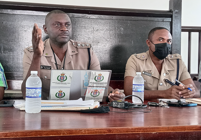 1. DSP Mark Harris (left), head of the Old Harbour police sub-division, speaking at a town hall meeting at the Old Harbour Court House on March 13, 2022. Beside DSP Harris is SSP Chris Phillips, commander in charge of the St Catherine South Division. (OH News Photo)