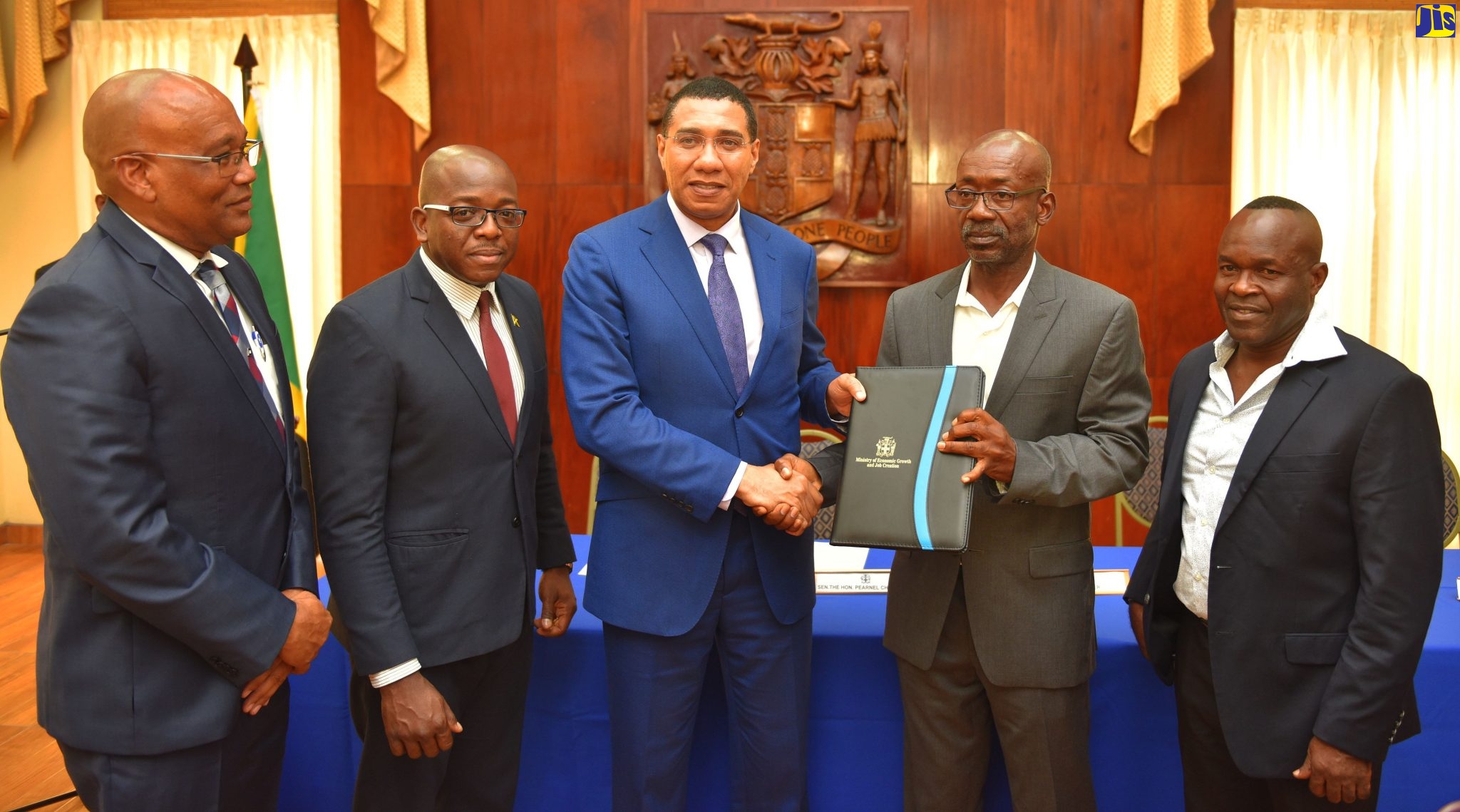 Prime Minister, the Most Hon. Andrew Holness (centre), presents Director, Rite Solutions Development Company, Owen Campbell (2nd right), with a signed copy of the joint venture agreement for the provision of 623 new solutions under the Shooter's Hill Housing Development project in Portmore, St. Catherine. The agreement, between the Housing Agency of Jamaica (HAJ) and Rite Solutions, was signed at Jamaica House on Thursday (Aug. 8). Others (from left) are: Chairman, HAJ, Norman Brown; Minister without Portfolio in the Ministry of Economic Growth and Job Creation, Senator the Hon. Pearnel Charles Jr.; and Director, Rite Solutions Development Company, Vincent Taylor.