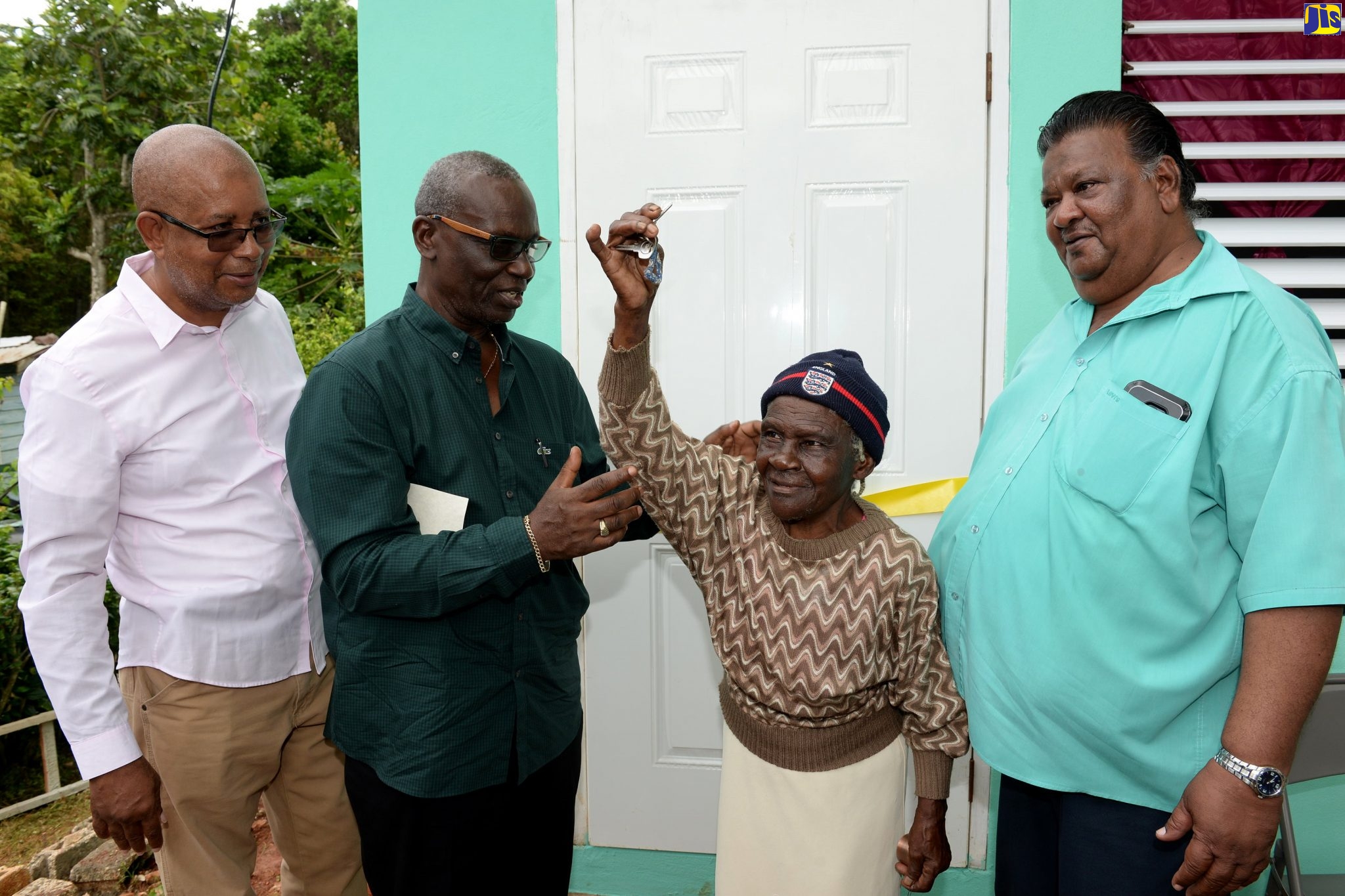 Ninety-five year old Nora Johnson (second right), proudly displays the key to her new home which was handed over to her by Local Government and Community Development Minister, Hon. Desmond McKenzie (second left), during a ceremony in Mendez District, Point Hill, St. Catherine on Monday (October 7). Looking on (from left) are Mayor of Spanish Town, Councillor Norman Scott; and Councillor for the Point Hill Division, Wesley Suckoo. Ms. Johnson was provided with the studio unit under the Government’s Indigent Housing Programme. (JIS Photo)
