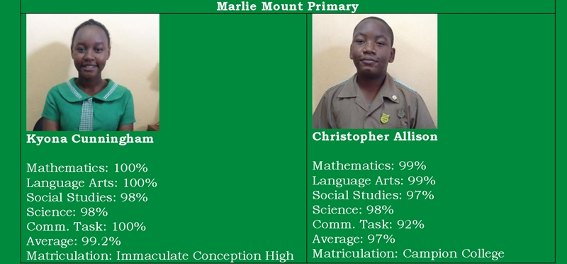 However, the star performer came from Marlie Mount Primary’s Kyona Cunningham. The top girl, who is heading to the all girl school of Immaculate Conception High, just missed out on a perfect score with scores of 98 per cent in science and social studies being her lowest marks. Top boy Christopher Allison will continue his education at Campion College, after impressing with a 97 per cent average.