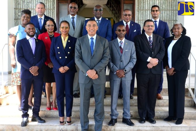 Prime Minister, the Most Hon. Andrew Holness (foreground) with members of the Constitutional Reform Committee (CRC) at Jamaica House in St. Andrew on March 22. Minister of Legal and Constitutional Affairs, Hon. Marlene Malahoo Forte (second left) and Ambassador Rocky Meade (third right), are co-chairs of the committee. (JIS Photo)