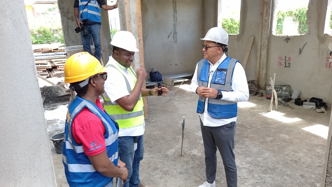Work completed to date includes site preparation, demolition, and foundation laying. The main structural elements—walls and columns—are now in place. Roofing is approximately 75 per cent finished, while internal works have progressed to rough casting and rendering. Ceiling installation is also nearing completion.