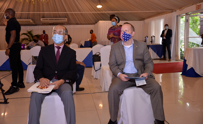 Minister of National Security, Dr Horace Chang and Chargé d’ Affaires of the United States Embassy, John McIntyre listens attentively to presentations at the launch. (Contributed Photo)