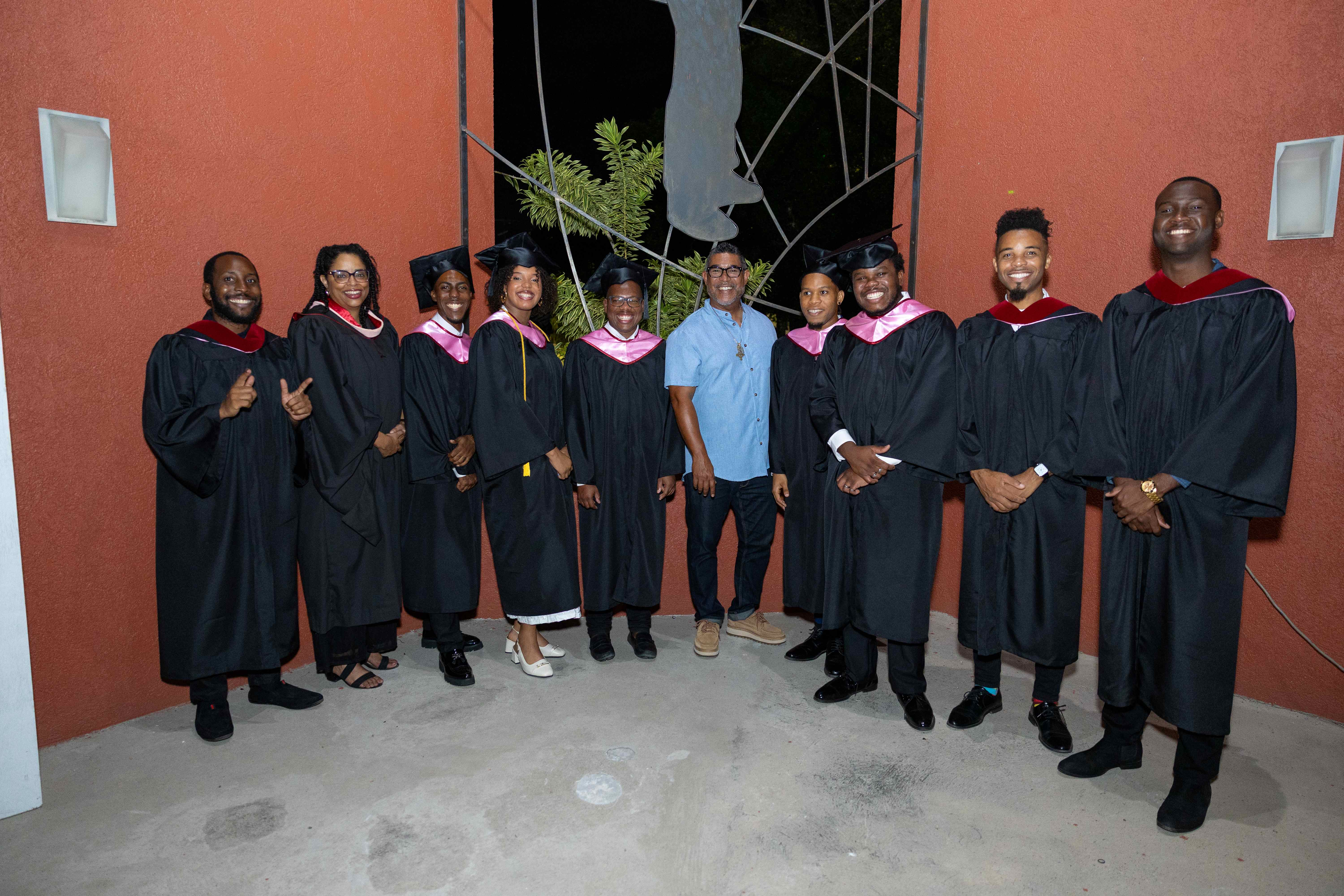 Celebrating the achievements are (from left) brass instructor Leon Ince; director of music Gay Magnus; valedictorian drummer/percussionist Jonathan Gordon; violinist/vocalist Zuri Aiko Gordon; commencement speaker and artiste manager Steve Wilson; percussionist Sanje Landell; commencement speaker Steve Wilson; keyboardist Matthew Reid; bass guitarist Alejandro Keating; senior music instructor Clayon Samuels and keyboard and technology instructor Evad Campbell.