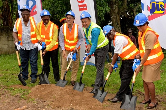 Minister of Health, Dr. the Hon. Christopher Tufton (third right), breaks ground for the $25-million Brown’s Hall Health Centre in St. Catherine on Wednesday (October 31). Others (from left) are Deputy Mayor of Spanish Town and Councillor for the Ginger Ridge Division, Ralston Wilson; Project Manager at the National Health Fund (NHF), Orette Clarke; Sales and Marketing Manager at Omni Industries Limited, Vincent Clarke; Chairman and Managing Director at Kemteck Development and Construction Limited, Sylvester Tulloch; and Senior Public Health Nurse at the South East Regional Helath Authority (SERHA), Marlene Stephenson.