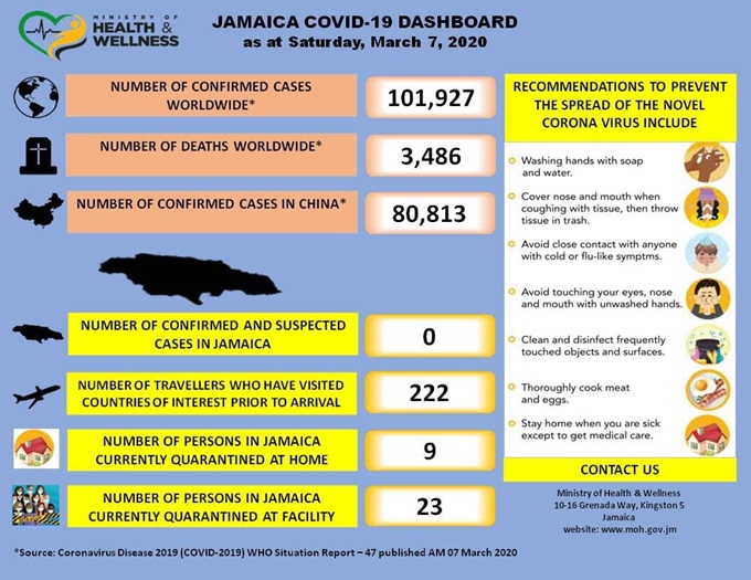 A snapshot of Jamaica's situation as it relates to the novel coronavirus (COVID-19) as well as the global data as at March 7, 2020. (Source: MOHW)