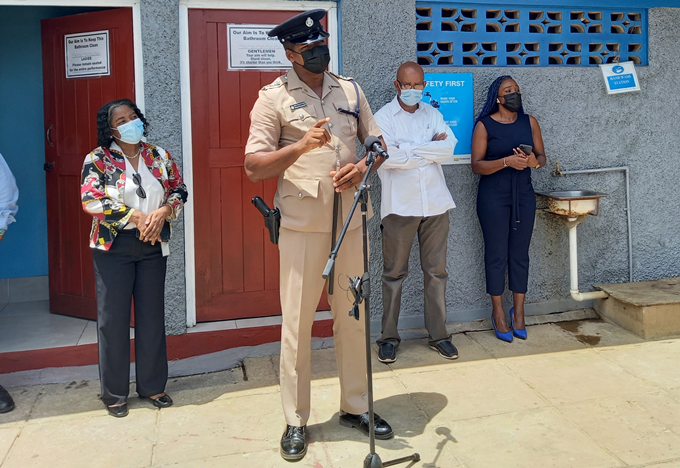 Then DSP and former Old Harbour Police Commander Damion Manderson addressing vendors in the Old Harbour Market on June 23, 2021 (OH News Photo)