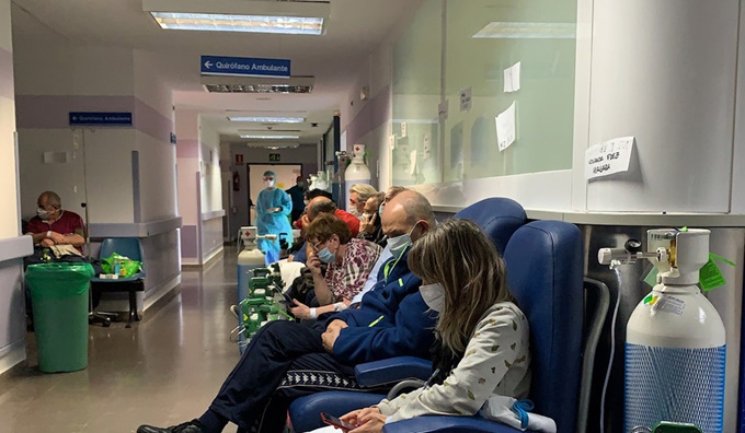 Patients wait in a corridor at the Severo Ochoa Hospital in Madrid, which is on the front line of the battle against COVID-19. (Luis Díaz Izquierdo/UN News)