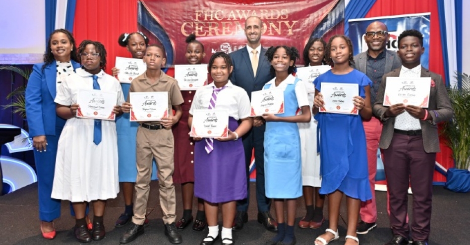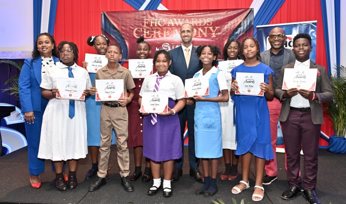 FHC 2025 Primary Exit Profile Scholars (from 2nd left) Zamaryah Hines; Alake-Kia Burrell; Rajauni Horne; De-vonee Greenfield; Isabelle Thomas; Kayrah Fullerton; Taejha Goulbourne; Keira Forbes; and Kai’den Evering. Sharing the moment are: FHC Director of FHC Credit Union and Board Secretary FHC Foundation Nickiesha Walsh (left); Business Consultant and Motivation Speaker Jeffrey J. Azan (centre); and FHC Credit Union CEO Xavier Allen.