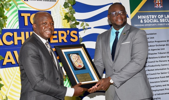 Minister of Labour and Social Security, Hon. Pearnel Charles Jr., (left), presents Jordon Freeman with the 2024 Programme of Advancement through Health and Education (PATH) Trailblazer Award, during the PATH Top Achiever’s Awards Ceremony at the Spanish Court Hotel in New Kingston on April 11.(JIS Photo)