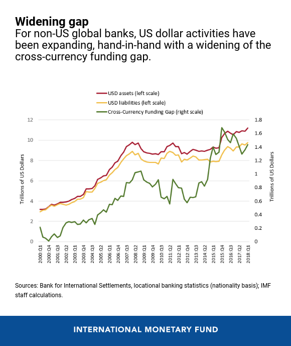 As we explain in Chapter 5 of the latest Global Financial Stability Report, non-US banks continue to play a key role in dollar lending around the world. Indeed, their dollar assets rose to $12.4 trillion by mid-2018 from $9.7 trillion in 2012 and remain comparable to pre-crisis levels relative to their total assets.