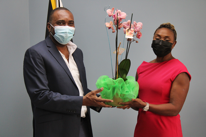 Caribbean Regional Director of the AIDS Healthcare Foundation, Dr. Kevin Harvey, presents an orchid to the Minister of State in the Ministry of Health and Wellness, Hon. Juliet Cuthbert during a courtesy call at the Ministry on International Women's Day, March 8, 2022.