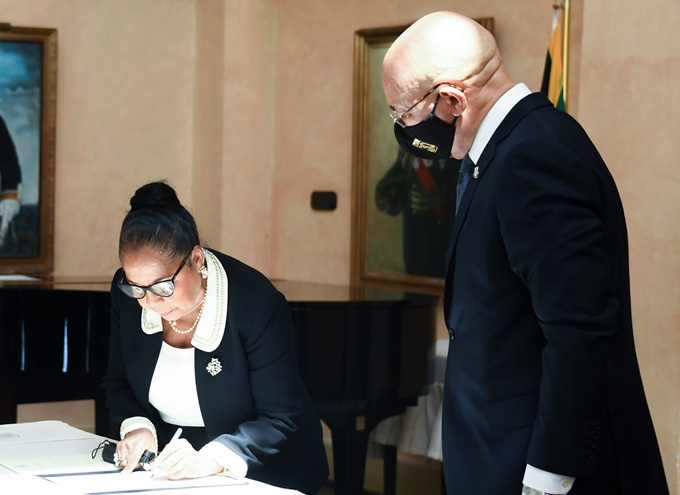 Icylin Golding (left) affixes her signature after accepting her appointment at Custos of St Catherine from Governor-General Sir Patrick Allen. (Contributed Photo)