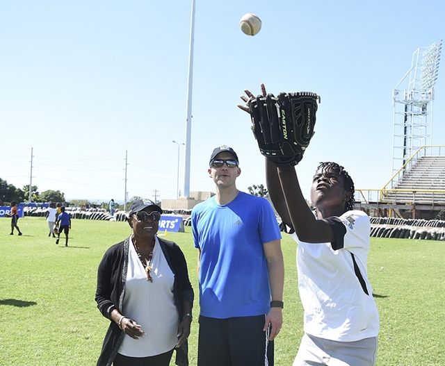 Donae Brown of Dupont Primary School makes catch during the BMR Energy/CEBF Goodwill Baseball Visit clinic at the National Stadium East field, while being observed by Sport Minister Olivia Grange and Jamaican-born former Major League Baseball player Justin Masterson