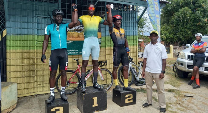 Jerome Forrest (centre) won the Elite Category 1 ahead of Barenton Bailey and Donrick Fearon. At far right is Dr Wayne Palmer, president, Jamaica Cycling Federation. (OH News Photo)