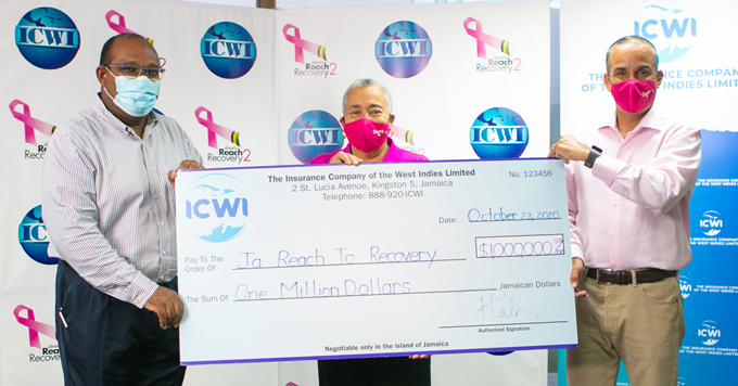 Jamaica Reach to Recovery (JRR), the support arm of the Jamaica Cancer Society (JCS), was presented with a cheque for JMD$1,000,000 from the Insurance Company of the West Indies (ICWI) last Friday at their Kingston head office.