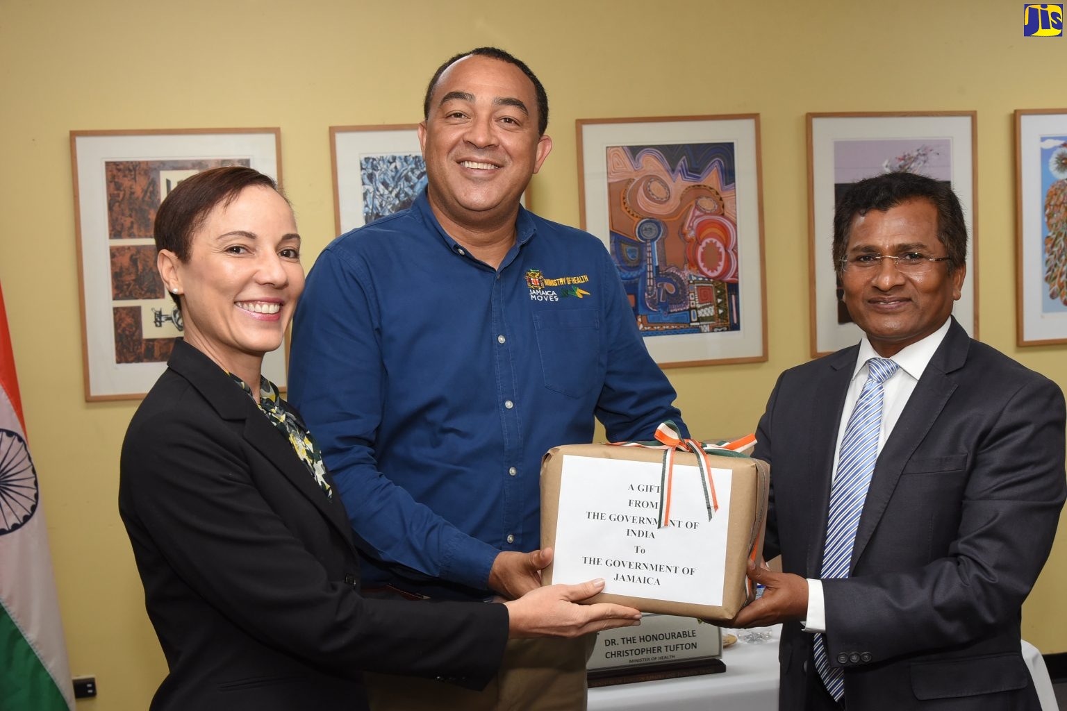 Foreign Affairs and Foreign Trade Minister, Senator the Hon. Kamina Johnson Smith (left); and Health Minister, Dr. the Hon. Christopher Tufton (centre), receive a package of medication from Indian High Commissioner to Jamaica, His Excellency, Sevala Naik. Medications, valued at US$150,000, was handed over to the Government at the Foreign Affairs Ministry