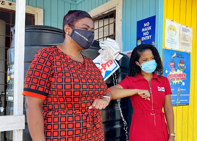 Nadisha Moore, principal of the High House Basic School and Sherrae Wong, retail manager at the Hi-Pro Ace Supercentre bump elbows as they pose in celebration of the school’s new 400 gallon water tank donated by Hi-Pro. (Contributed Photo)