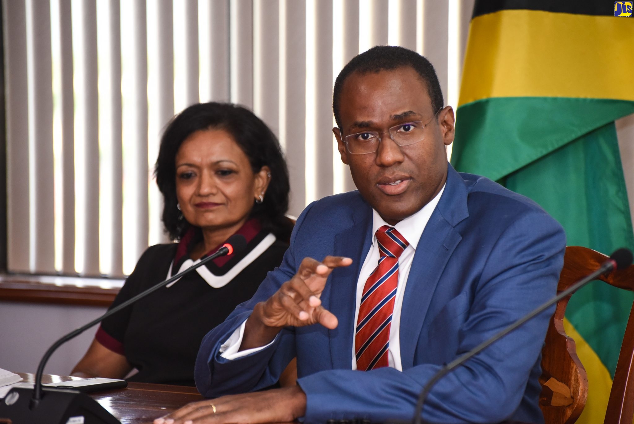Finance and the Public Service Minister, Dr. the Hon. Nigel Clarke, addresses a recent media round-table forum at the Ministry’s offices in Kingston. Listening is outgoing International Monetary Fund (IMF) Mission Chief to Jamaica, Dr. Uma Ramakrishnan. (JIS Photo)