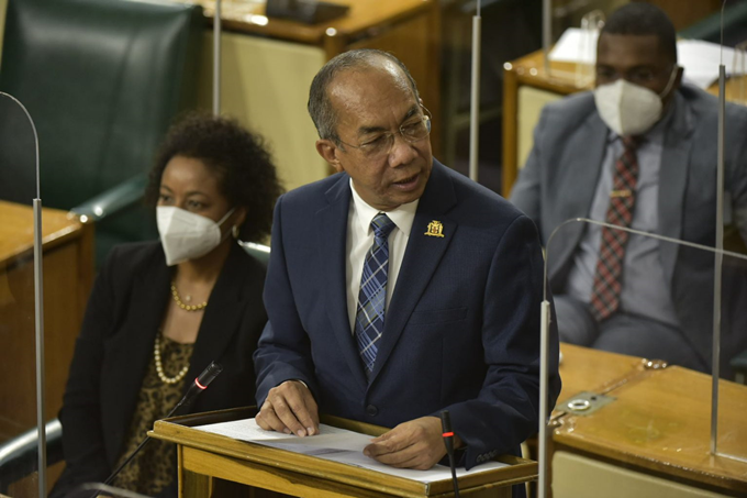 Minister of National Security, Hon. Dr. Horace Chang, speaks in the 2021/22 Sectoral Debate in the House of Representatives on May 25. At left is Attorney General, Hon. Marlene Malahoo Forte. (JIS Photo)
