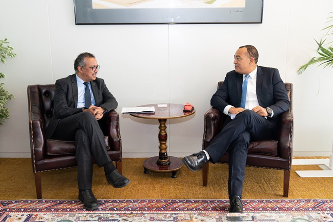 Health and Wellness Minister Dr Christopher Tufton (right) meets with WHO Director-General Dr Tedros Adhanom Ghebreyesus ahead of the 75th World Health Assembly in Switzerland. (Contributed Photo)