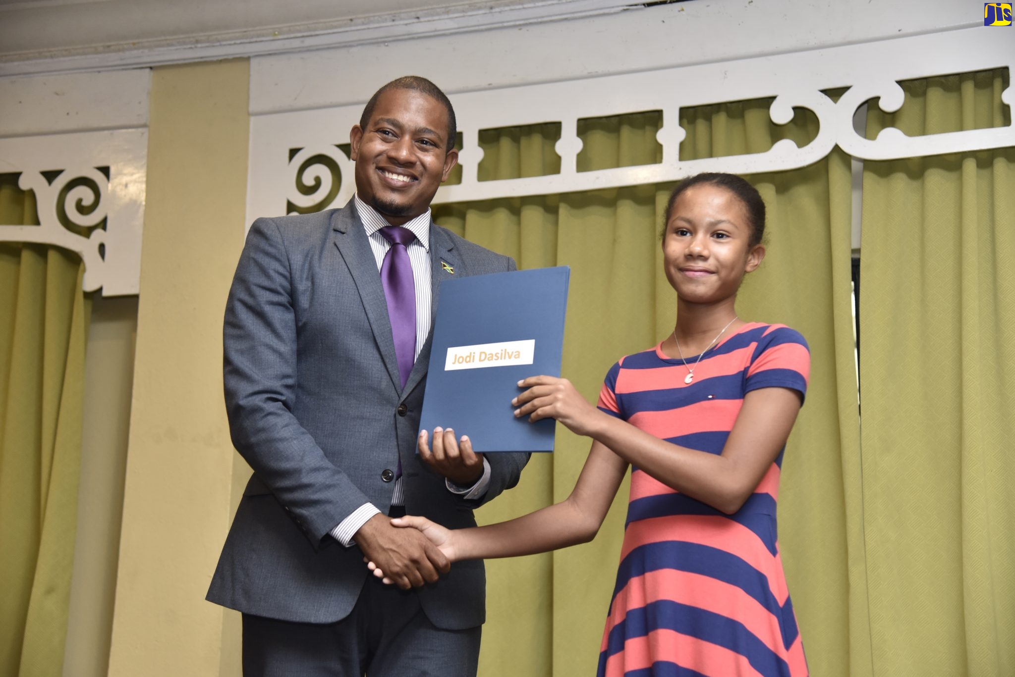 Minister of State in the Ministry of Industry, Commerce, Agriculture and Fisheries, Hon. Floyd Green (left), presents a bursary to Jodi Dasilva. (JIS Photo)