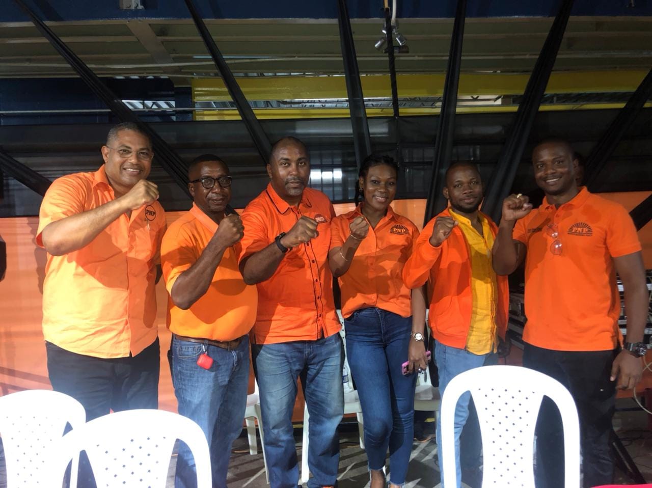 Julian Robinson (3rd from left) and other Comrades display the party's symbol during that PNP Old Harbour North Divisional Conference at Davis Primary on June 12, 2022.