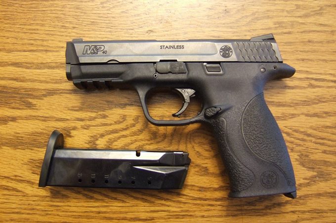 During the search one black Smith and Wesson 9mm pistol with a magazine containing eight 9mm cartridges was found on the floor on the passenger side of the front seat.