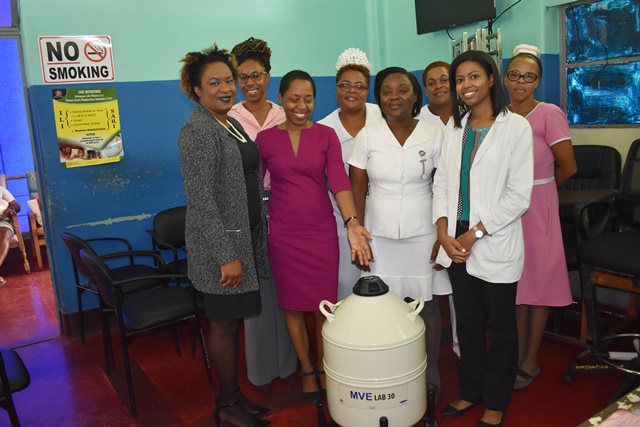 Dr. Sandra McLeod (2nd left), consultant dermatologist and head of department with staff of skin clinic examining the 30L liquid nitrogen dewar. Also, present is Jacqueline Ellis (left), chief executive officer, Liguanea Regional Hospitals