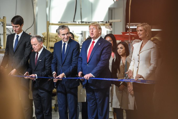 The LVMH Group celebrates the inauguration of the Louis Vuitton Rochambeau Ranch leather goods workshop in Texas, in presence of United States President Donald J. Trump, LVMH Chairman & CEO Bernard Arnault, Louis Vuitton Chairman & CEO Michael Burke. (Image Credit: LVMH)