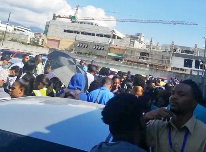 Workers gather in the parking lot of Centre Stage in New Kingston after a 7.7 magnitude earthquake rocked the island today. (Contributed photo)