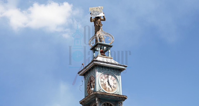 The Browns Hall, St Catherine this afternoon native climbed atop the Old Harbour clock to display a banner with the words "say no to dirty music".