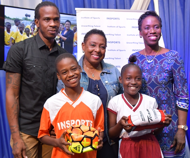 Minister of Sport Olivia Grange (centre) at the launch with Ian “Pepe” Goodison (left), former national football player and ambassador for the INSPORTS Primary School Football Competition; Dr Paula Daley- Morris (right), president, Netball Jamaica; with Anthony McDonald (front left), captain, Denham Town Primary School football team; and Shawna-Kay Davis, captain Greenwich Primary School netball team. (OH News Photo)