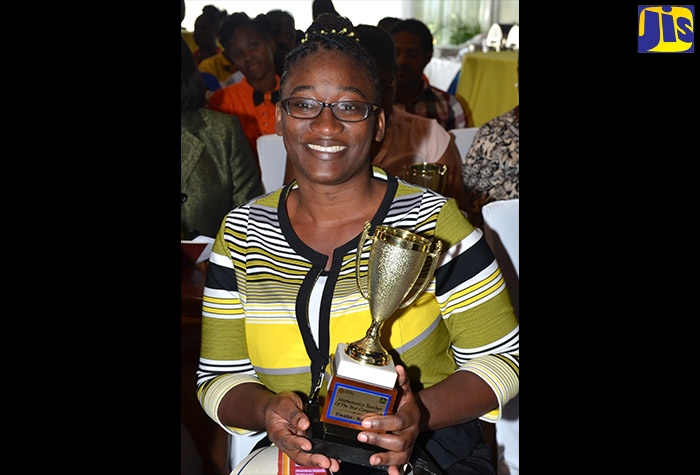 Mathematics Teacher of the Year for 2019, Karema Mundell-Thomas, holds her trophy at the launch of National Mathematics Week on March 25, at the Terra Nova All-Suite Hotel in St. Andrew. (JIS Photo)