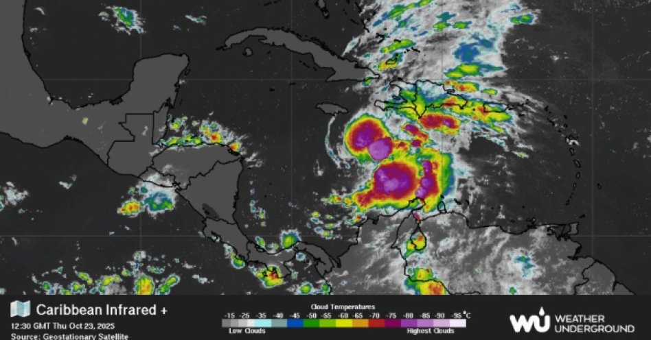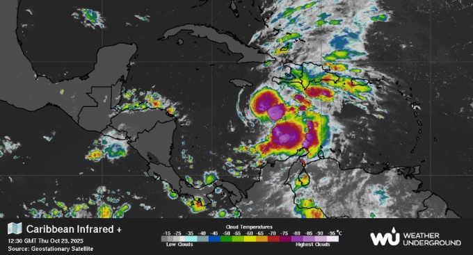 An infrared image of the Caribbean Sea provided by the Geostationary Satellite shows the current status of Tropical Storm Melissa as at 7:30 AM Jamaica Time on Thursday, October 23, 2025.