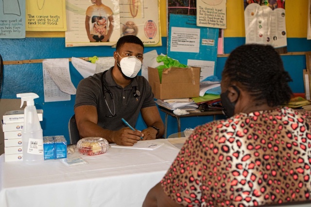 Dr Damel Spooner conducts a medical consultation with a resident from Old Harbour Bay. (Photo: Contributed)
