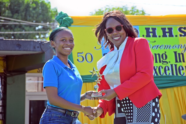 Elise Aarons (left) accepts her award from Old Harbour High past student Dr. Euphima Burke-Robinson, education officer, Ministry of Education. (Photo: Peter Simmonds/Mystic5 Multimedia Services)