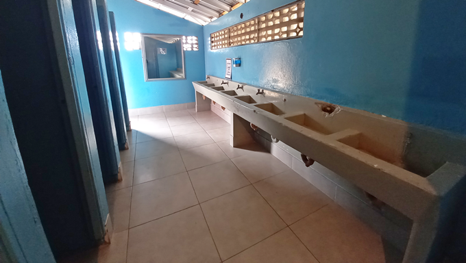 Fresh painting, pristine ceramic tiles and a water tank were among the most noticeable changes to the renovated bathroom at the Old Harbour Market.