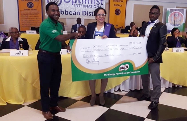 Chris Anthony Salter (left), consumer marketing manager Nestle Milo presents a symbolic cheque to , Governor of Optimist International Caribbean District Maria Streete-Hendricks (centre) and Obryan Leighton, Optimist International Caribbean District and Tri Star Sports.
