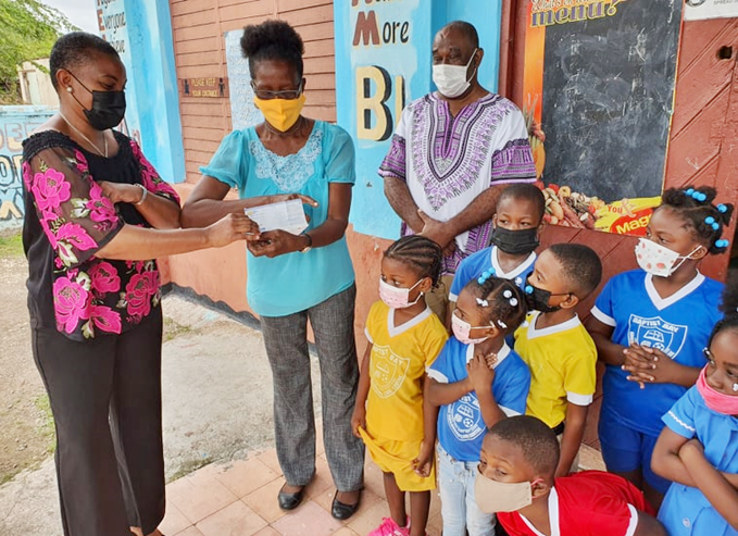 Yvonne Bartley, representing Baptist Basic School, accepts cheque from Shaene Senior (left) in the presence of Dennis May and students. (Contributed Photo)