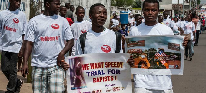 Liberian men march with anti-rape posters (UN photo).