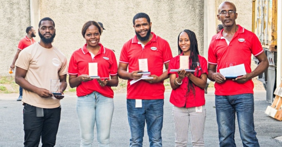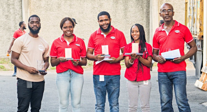 Akeele Johnson (Warehouse), Duane Taylor (Sanitation), Anthony Anglin (Production), Peter Collins (Engineering), Richard Thomas (Accounts), and Karimah Shepherd (Quality Lab) were the recipients.