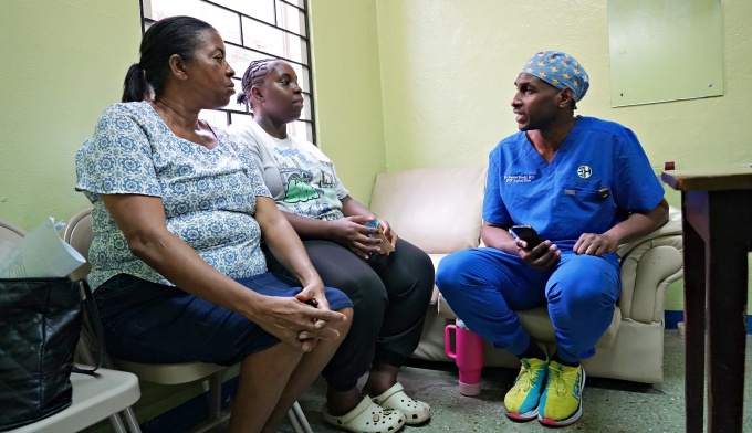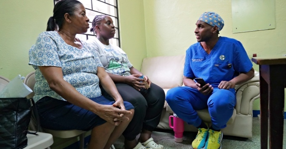 Dr. Jaysson T. Brooks, Orthopedic Surgeon from Dallas, Texas, shares a moment with a young patient and her mother before her surgery last Thursday at Kingston Public Hospital.