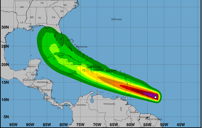 “There is a risk of wind and rainfall impacts in portions of Cuba, Jamaica, the Turks and Caicos and the Bahamas through early next week,” the NOC stated in its 5:00 pm bulletin.