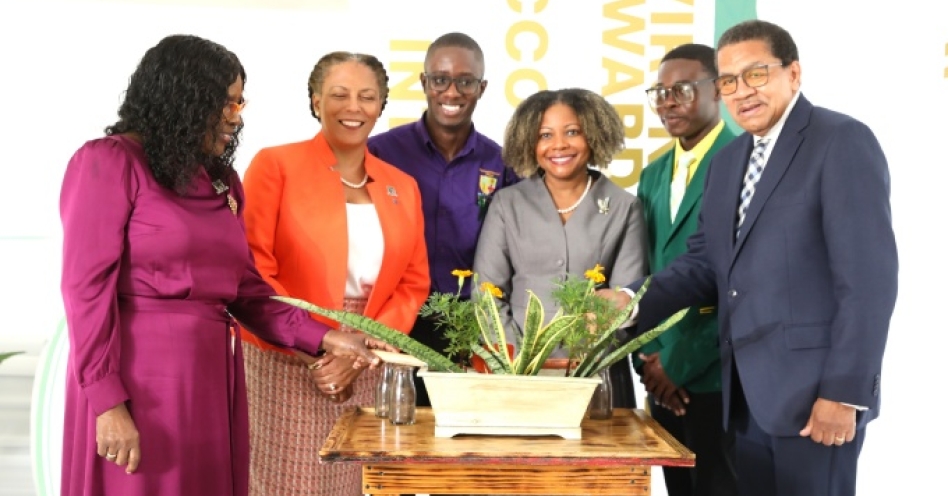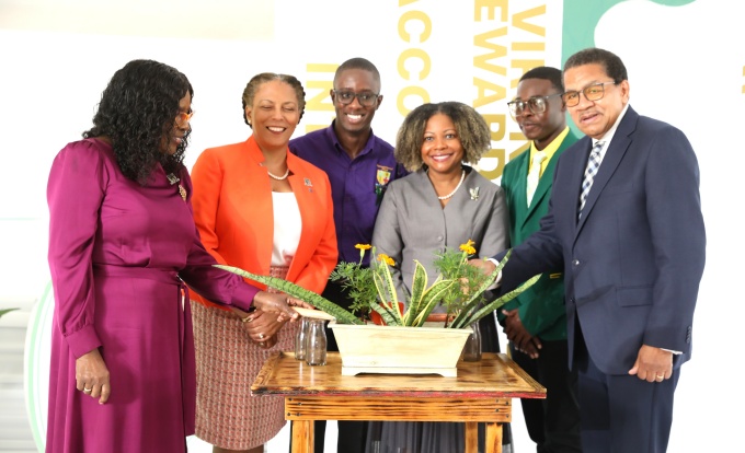 Participating in the ceremonial planting of the Dracaena Trifasciata (Snake Plant) are (from left) Shortwood Teachers’ College Patron of 140th Anniversary The Hon. Audrey Sewell; Shortwood Teachers’ College Principal Nadine Molloy; students Damalie Rowe; Minister of Education, Skills, Youth and Information Senator Dr. the Hon. Dana Morris Dixon; Tahj Alexander; and Board of Management Chairman Grantley Stephenson.