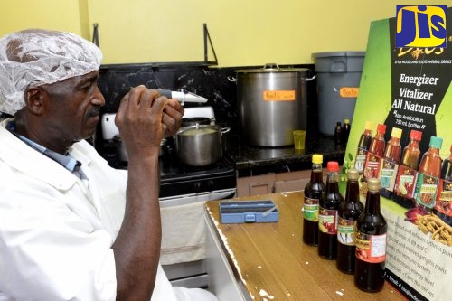 Chief Executive Officer, Wood Land Roots Natural Drinks, Oliver Welsh, tests the sugar content of one of his many natural products, at his company in Portmore, St. Catherine. (JIS Photo)