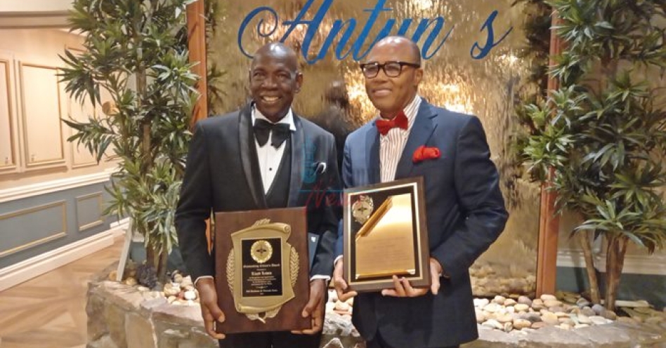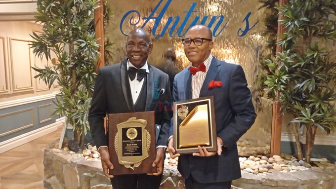 Lloyd Lewin (left) and Dr Eric Blake were rightfully celebrated by the Old Harbour and Friends Association (OHFA) at a grand event on Saturday night at Antun’s in Queens, New York. (OH News Photo)